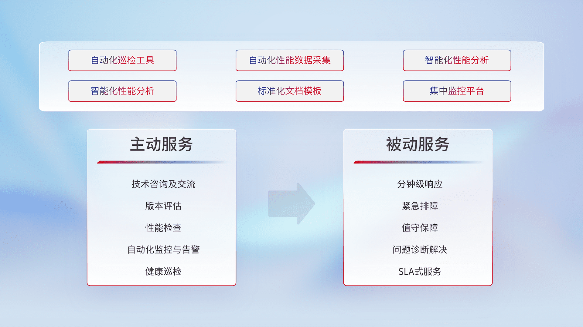 智能化工具和标准化文档,,,保障服务质量,,,提供主动服务(包含技术咨询、、、版本评估、、、、性能检查、、、自动化监控与告警、、、、健康巡检)和被动服务包含(分钟级响应、、、、紧急排障、、值守保障、、、问题诊断解决、、SLA服务)。。。